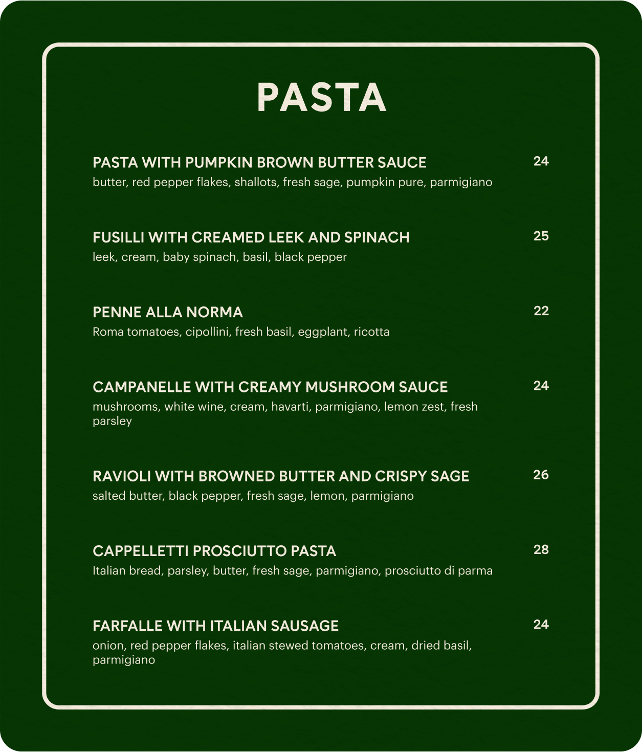 Here we blend time-honored techniques with the finest ingredients to create pasta dishes that evoke the spirit of Italy.